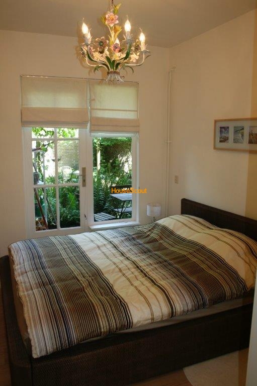The kitchen is equipped with breakfast table, gas hob, oven, fridge, dishwasher and microwave, washing machine and dryer and provides access to the back garden with a back entrance and shed. The bedroom is located at the back (approx. 10 m2) with doors to the back garden and a bathroom (shower/bath, wash basin) completes this lovely apartment which has laminate flooring throughout.